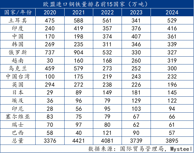 根据国际贸易管理局数据显示,2024年欧盟进口钢铁总量为3895万吨,同比2023年增长4.17%。其中2024年土耳其成为出口欧盟钢铁量最多的国家,出口量为529万吨,同比2023年明显增长,增幅达55.11%。