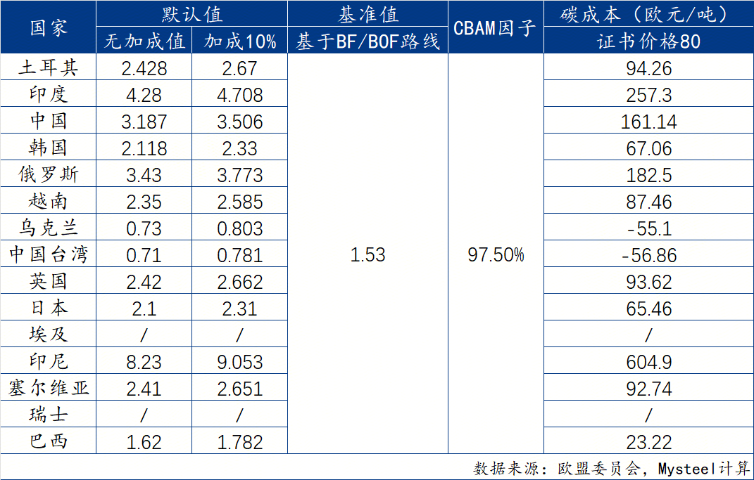 关键假设为:假设各国出口钢铁量均为单吨钢铁,跨部门修正因子设定值为1,生产工艺均为高炉-转炉工艺,欧盟CBAM 碳价约为80€80/tCO2,内嵌碳排放使用欧盟官方所公布的默认值,同时考虑加成值影响。