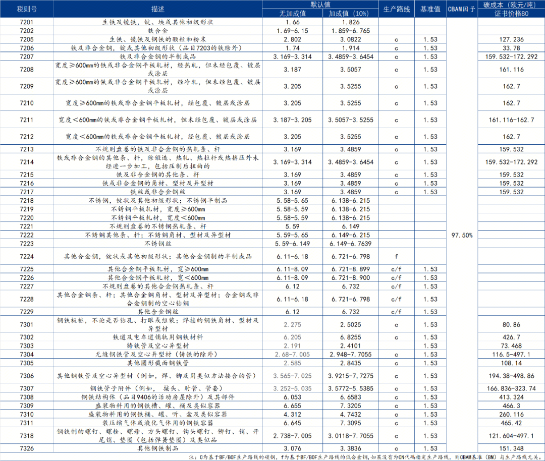 我们将欧盟委员会所列示我国钢铁税则号默认值进行归纳,主要包含四类,也就是生铁、铁及铁合金、不锈钢(包含不锈钢制品、平板轧材(区分宽度≥/<600mm)、不规则盘卷条杆等)其他合金(涵盖平板轧材、条杆、型材、空心型材等)、钢材 / 钢铁制品(如板材、铁道用材料、无缝钢管、其他钢管等,包含 “钢铁制的螺钉、螺母” 等紧固件)。整体税则号跨度为7202~7326,生产路线方面主要基于“高炉-转炉”路线。