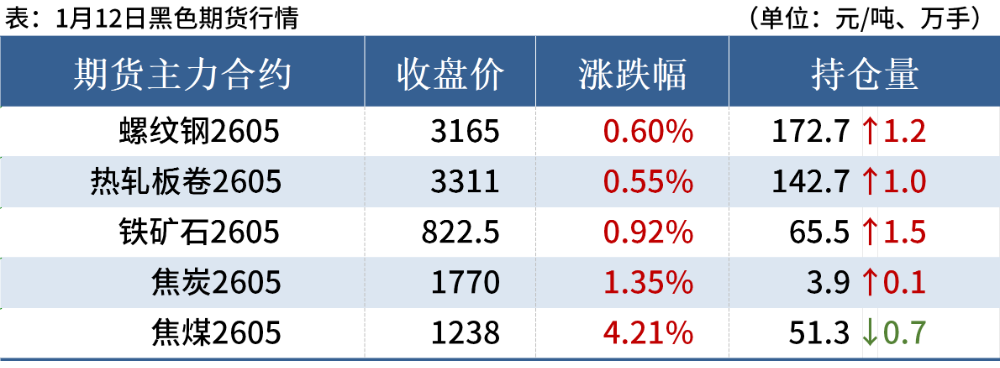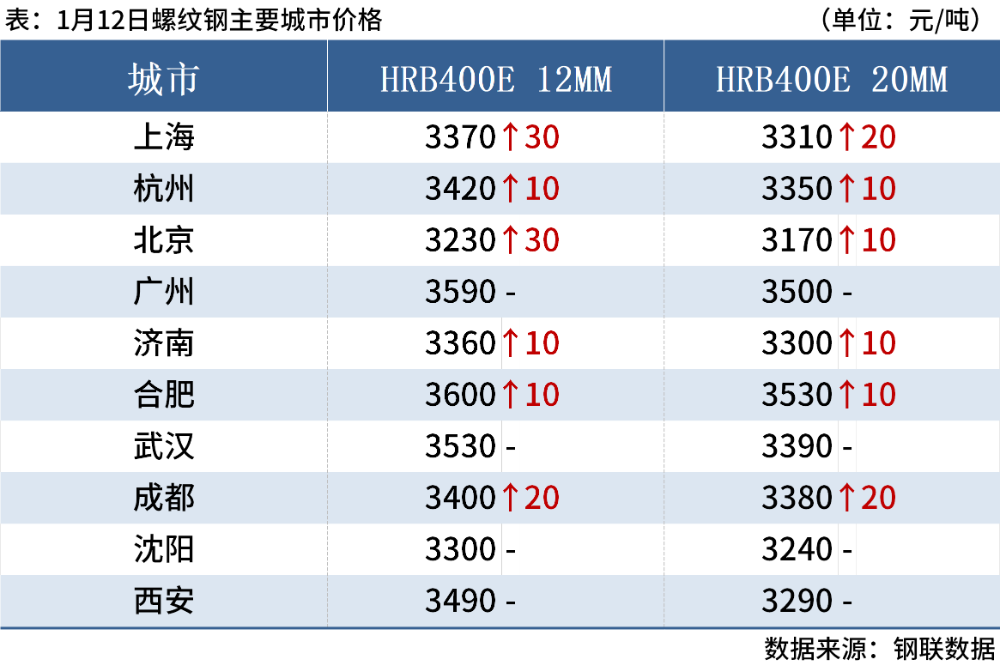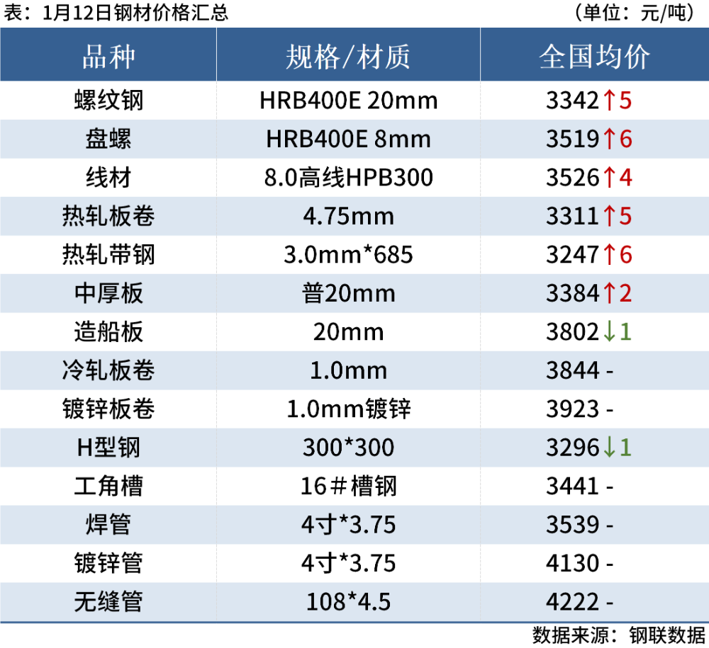1月12日,国内钢材市场价格窄幅上涨。唐山迁安松汀钢铁普方坯资源上调10至2980元/吨。黑色期货走强,市场交投氛围转好,商家积极出货,整体成交量尚可。