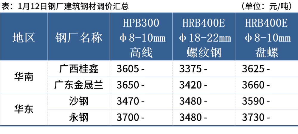 1月12日,4家钢厂持稳建筑钢材出厂价格。其中,沙钢、永钢持稳1月中旬建筑钢材出厂价。