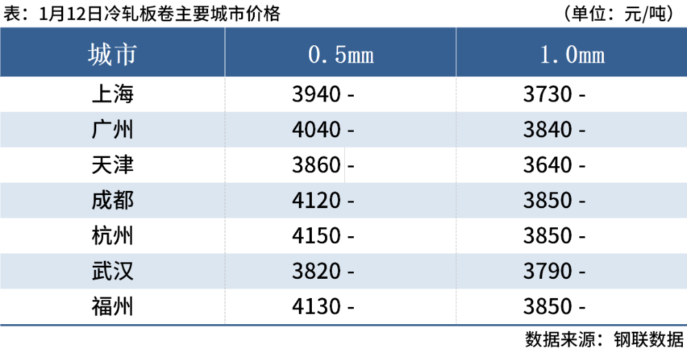冷轧板卷:1月12日,全国24个主要城市1.0mm冷卷均价3844元/吨,较上一交易日价格持平。黑色期货盘面震荡上行,市场交投氛围有所好转。市场为加大出货力度价格并未上调,以价换量下成交略有好转。心态方面,虽然期货上行提振了部分市场信心,但整体需求变化不大,贸易商对后市多持谨慎观望为主。综合来看,预计13日全国冷轧板卷价格或将窄幅震荡为主。