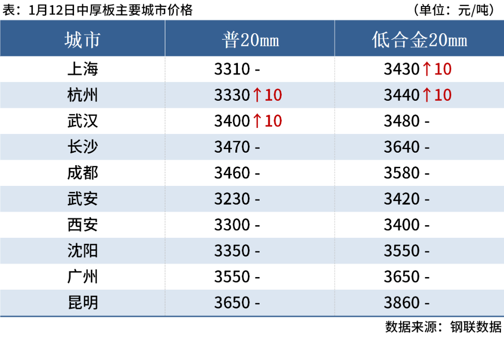 中厚板:1月12日,全国24个主要城市20mm普板均价3384元/吨,较上一交易日上涨2元/吨。目前多数中板厂普板资源排产较少,大多数以品种钢,锰板,定轧资源优先发货。目前市场普板大多出现缺货缺规格现象,现普板主要来源以北方钢厂为主,低合金出货较为正常。综合来看,基本面处于供需弱平衡的态势,成本支撑稳固,预计13日全国中厚板价格窄幅震荡运行。